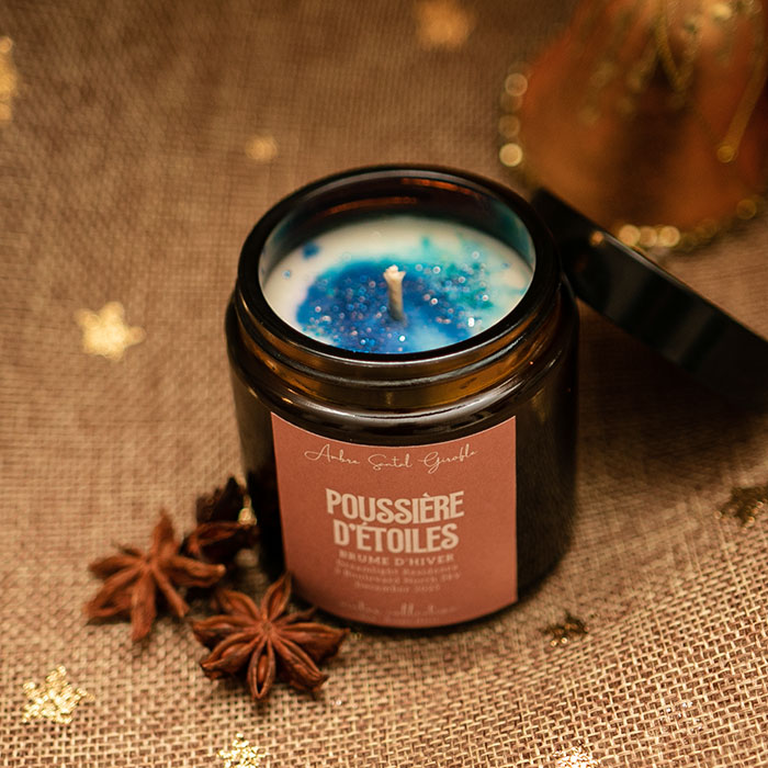 Élégante et mystérieuse, la bougie Poussière d’Étoiles invite à un voyage sensoriel sous un ciel parsemé d’éclats dorés.