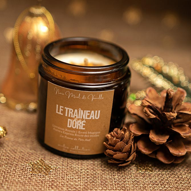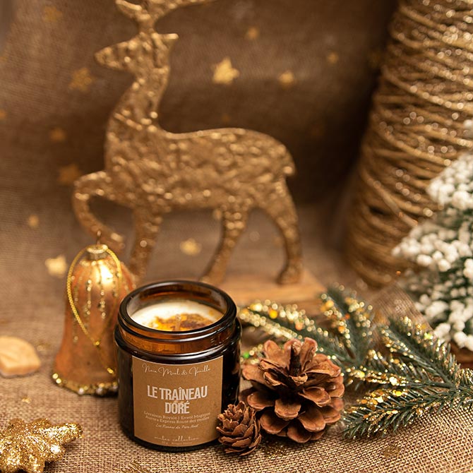 Succombez à la chaleur dorée de l’hiver avec la bougie Traîneau Doré, une création gourmande et lumineuse inspirée des douceurs de Noël.